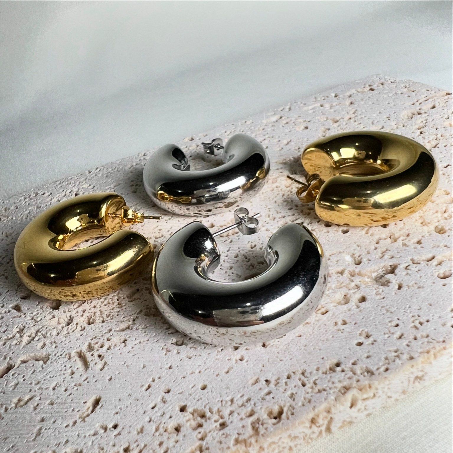 Eleva tu look con estos aretes chunky en dorado o plateado. Combinan con todo!